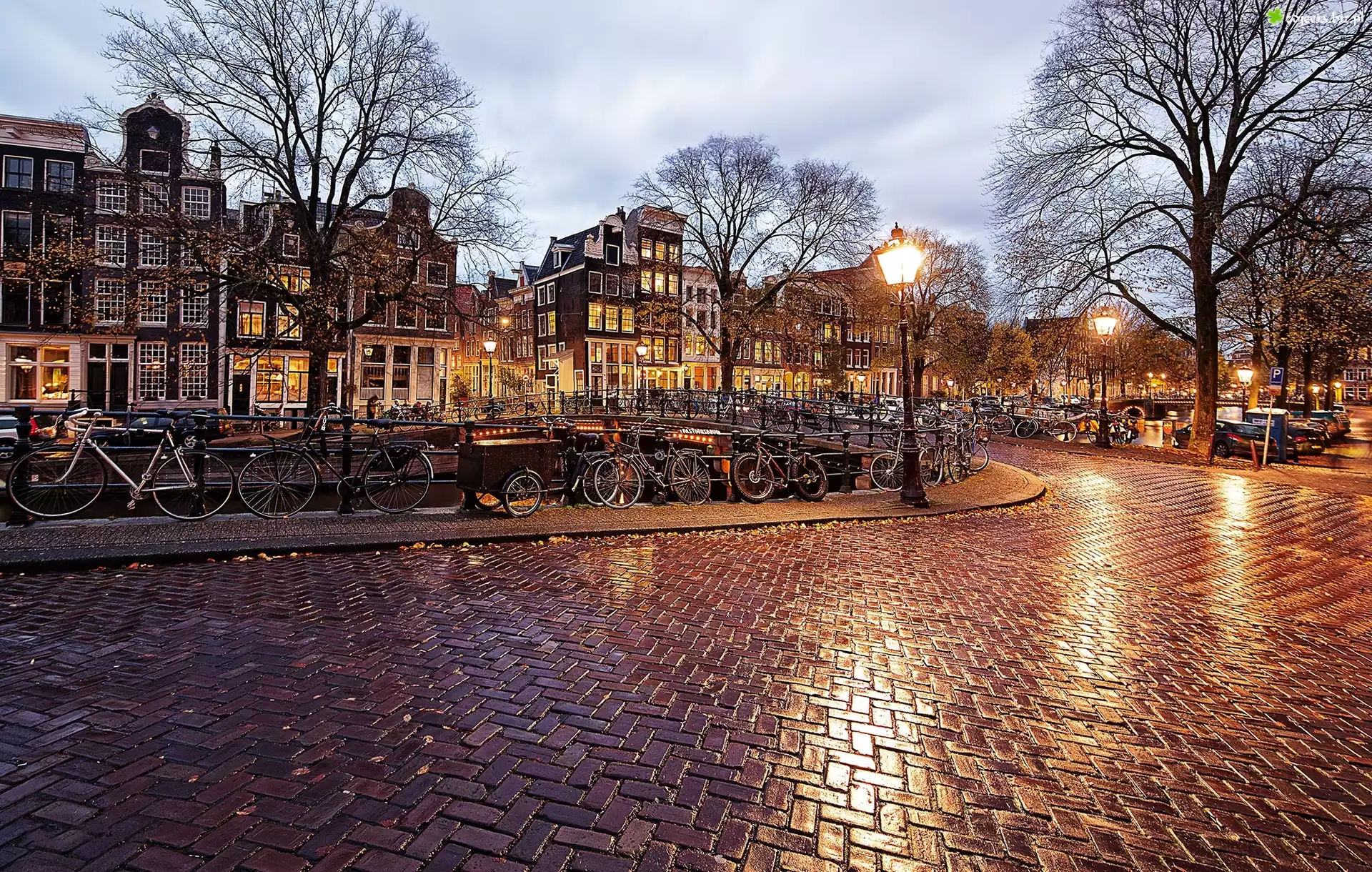 Zdjęcie, Amsterdam, Rowery, Kamienice, Latarnie