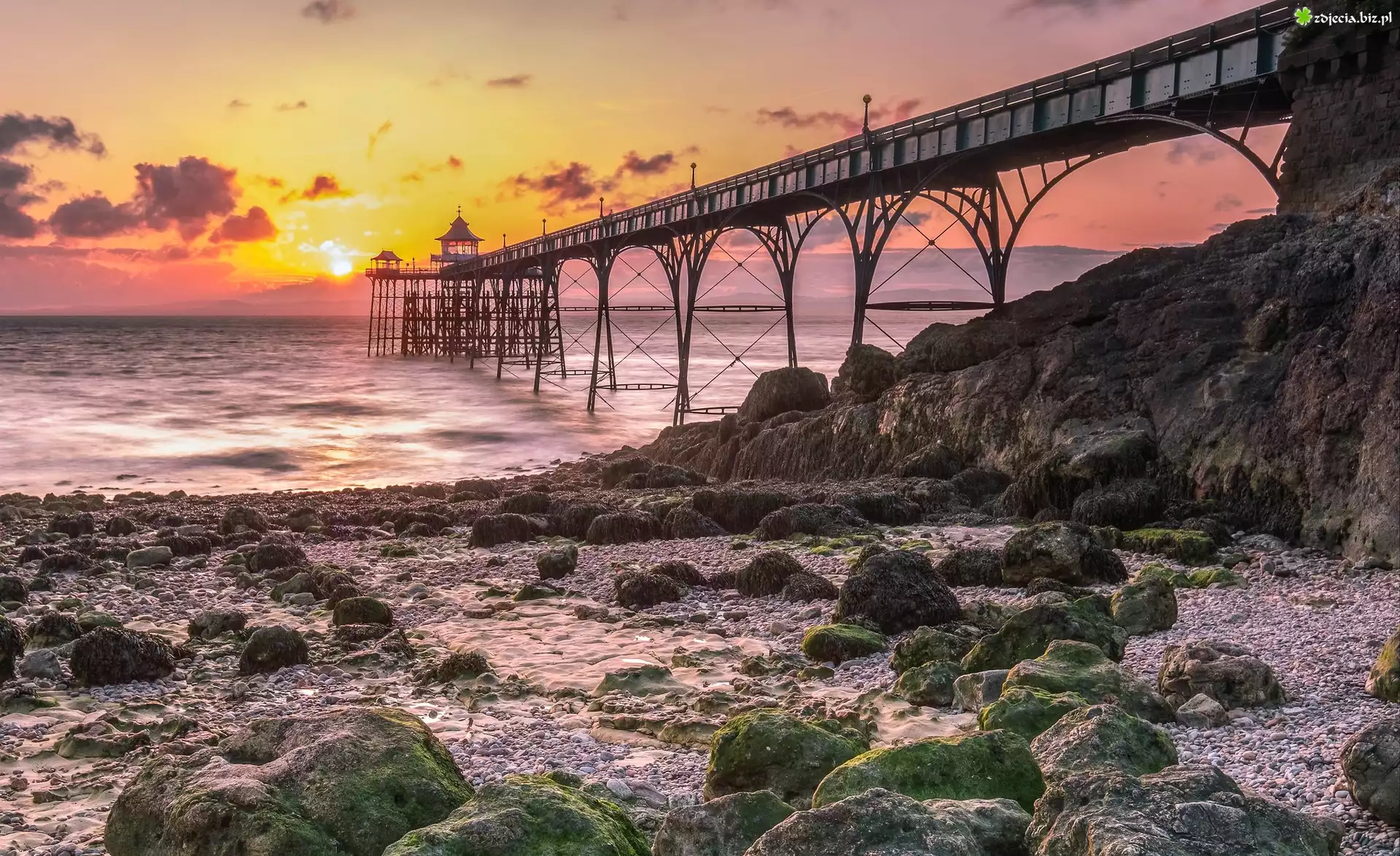 Zdjęcie Rzeka Severn, Molo Clevedon Pier, Wschód słońca, Kamienie, Clevedon, Anglia