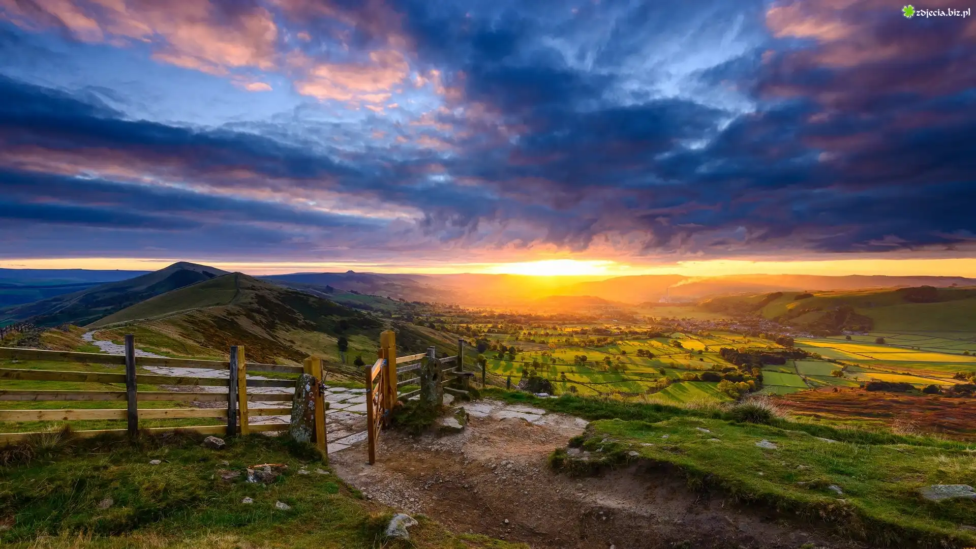 Zdjęcie Anglia, Hrabstwo Derbyshire, Park Narodowy Peak District, Wzgórza, Łąki, Pola, Dolina, Zachód słońca, Płot, Droga |