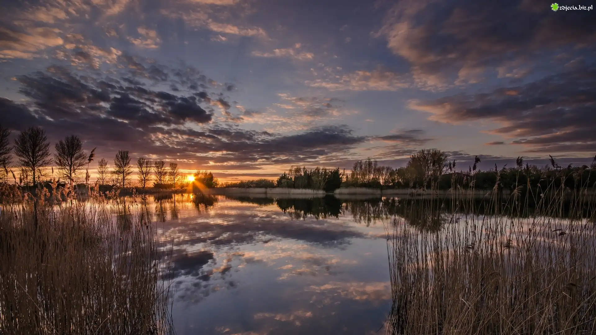 Zdjęcie Anglia, Maidstone, Rzeka Medway, Drzewa, Trawy, Zachód słońca Anglia