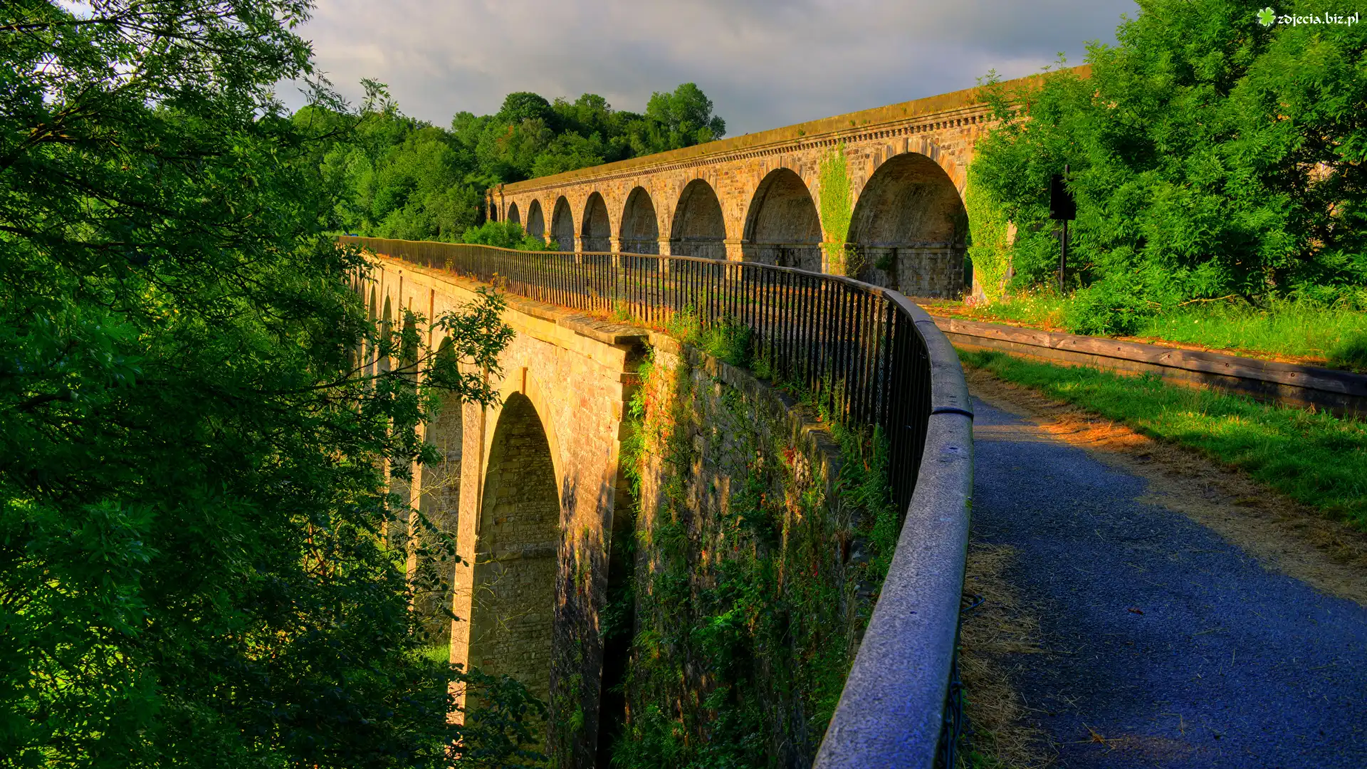Zdjęcie Most, Wiadukt, Atrakcja Chirk Aqueduct, Miejscowość Chirk, Hrabstwo Shropshire, Walia, Ogrodzenie, Droga, Drzewa, Roślinność |