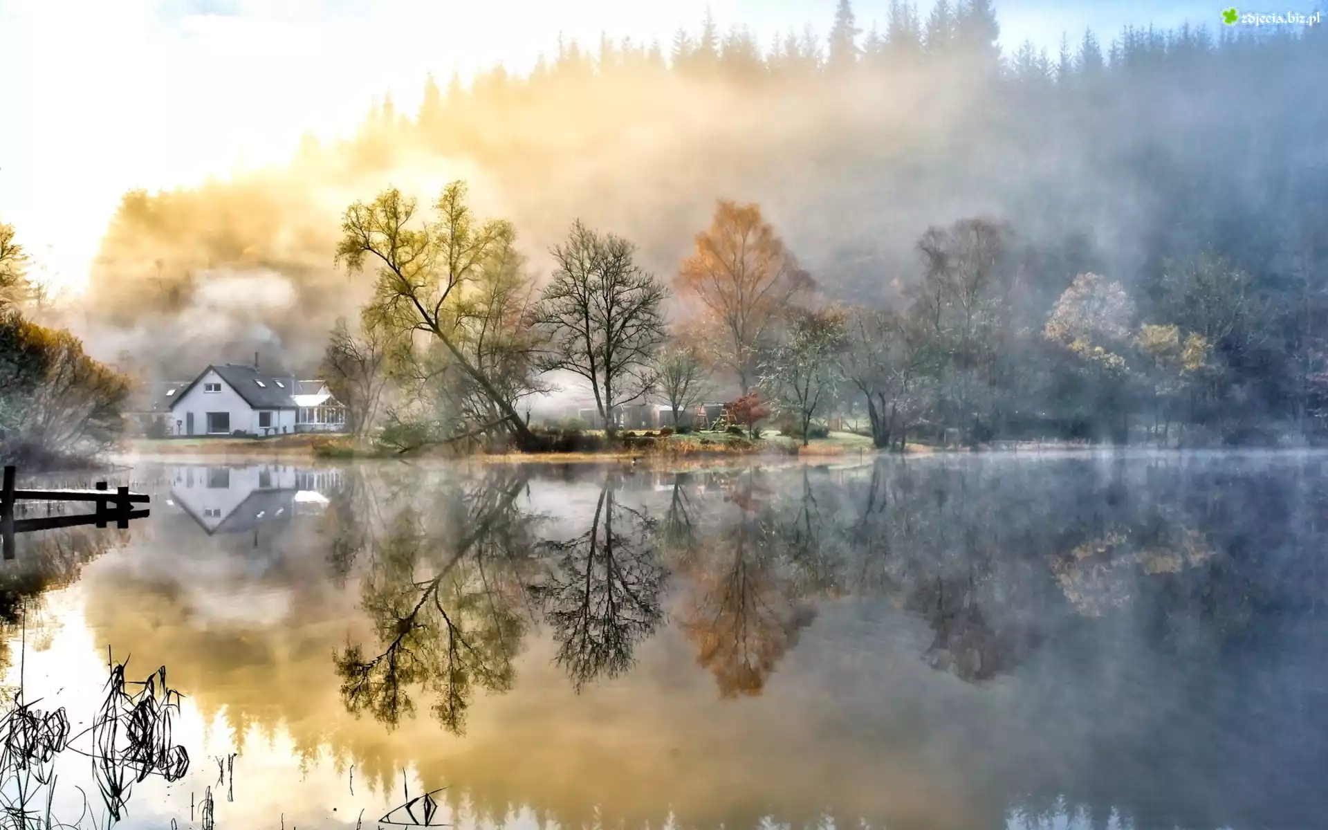 Zdjęcie Architektura, Jesień, Krajobraz, Jezioro, Mgła