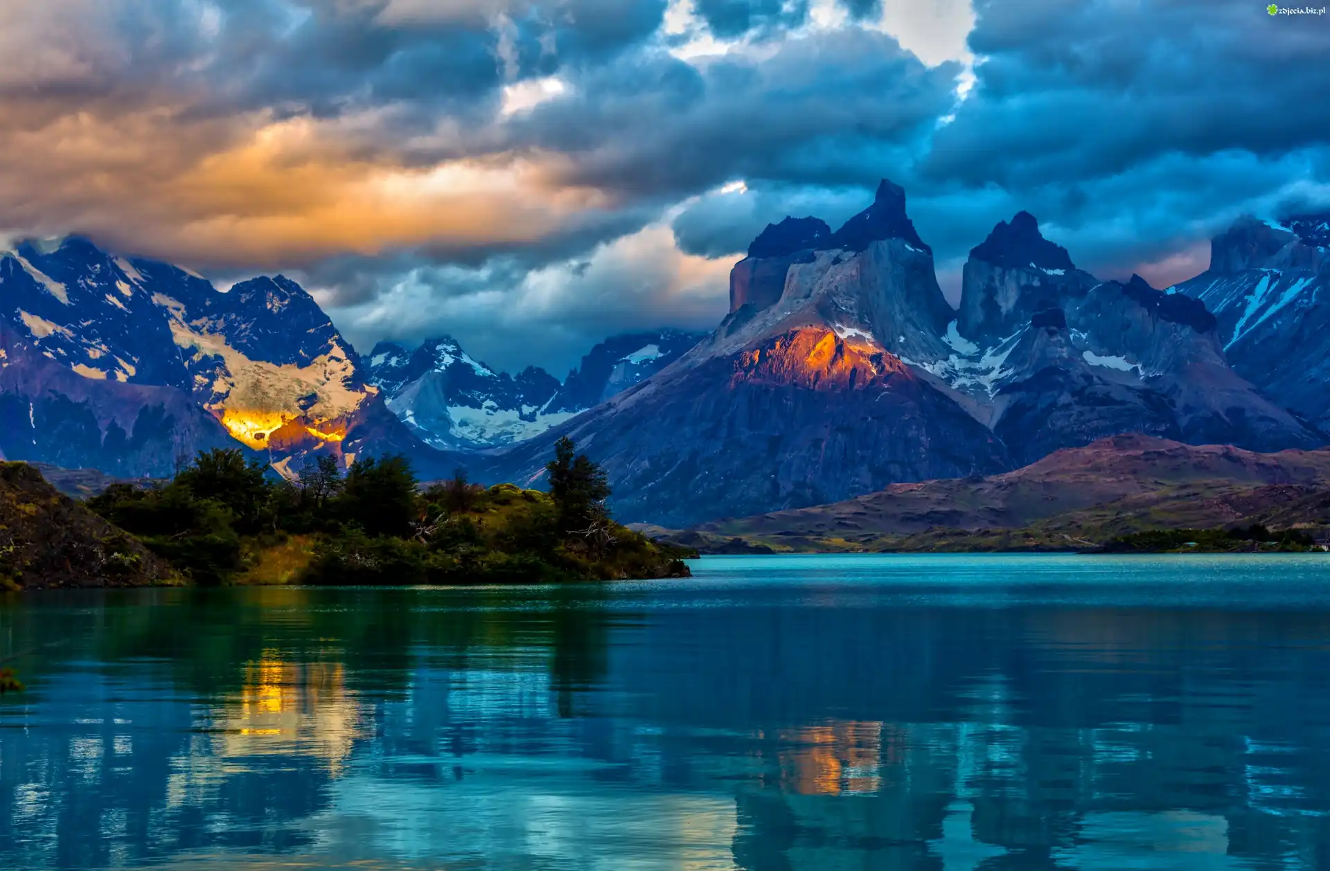 Zdjęcie, Argentyna, Patagonia, Góry, Jezioro, Drzewa, Chmury