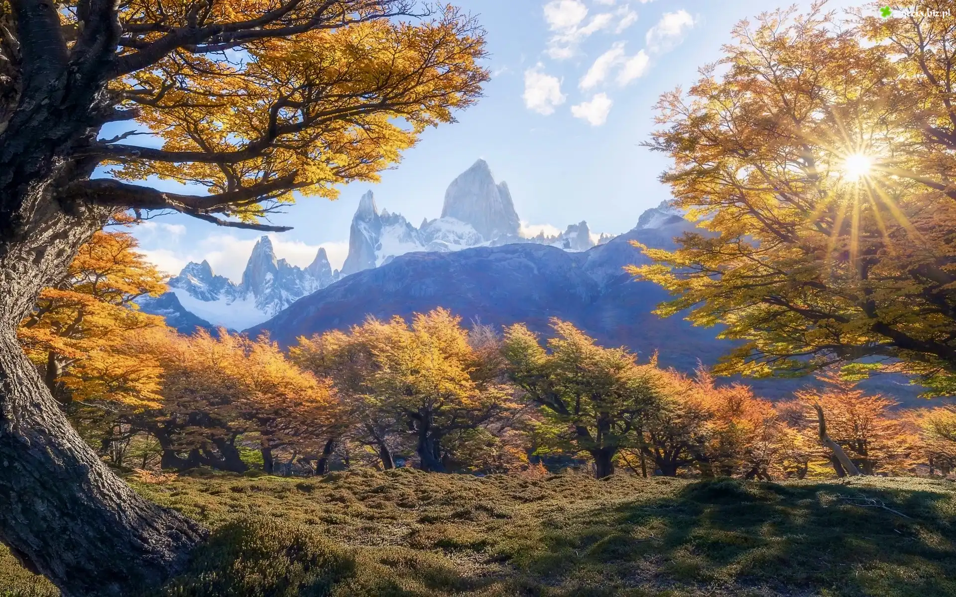 Zdjęcie Argentyna, Patagonia, Góry, Fitz Roy, Jesień, Drzewa, Promienie słońca