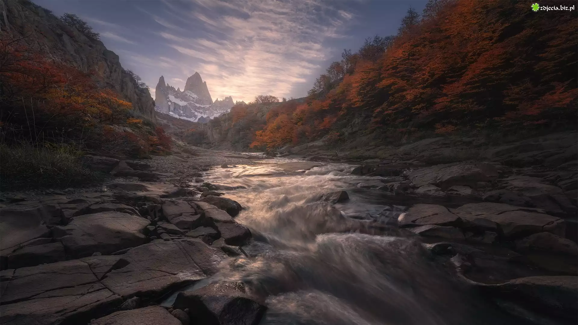 Zdjęcie Argentyna, Patagonia, Góry, Fitz Roy, Rzeka, Jesień, Drzewa, Kamienie