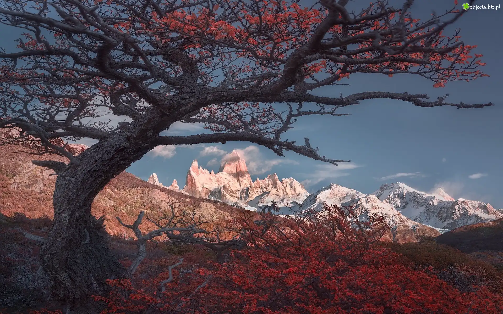 Zdjęcie Argentyna, Patagonia, Góry Andy, Szczyt Fitz Roy, Drzewa, Kolorowa, Roślinność, Jesień, Park Narodowy Los Glaciares |