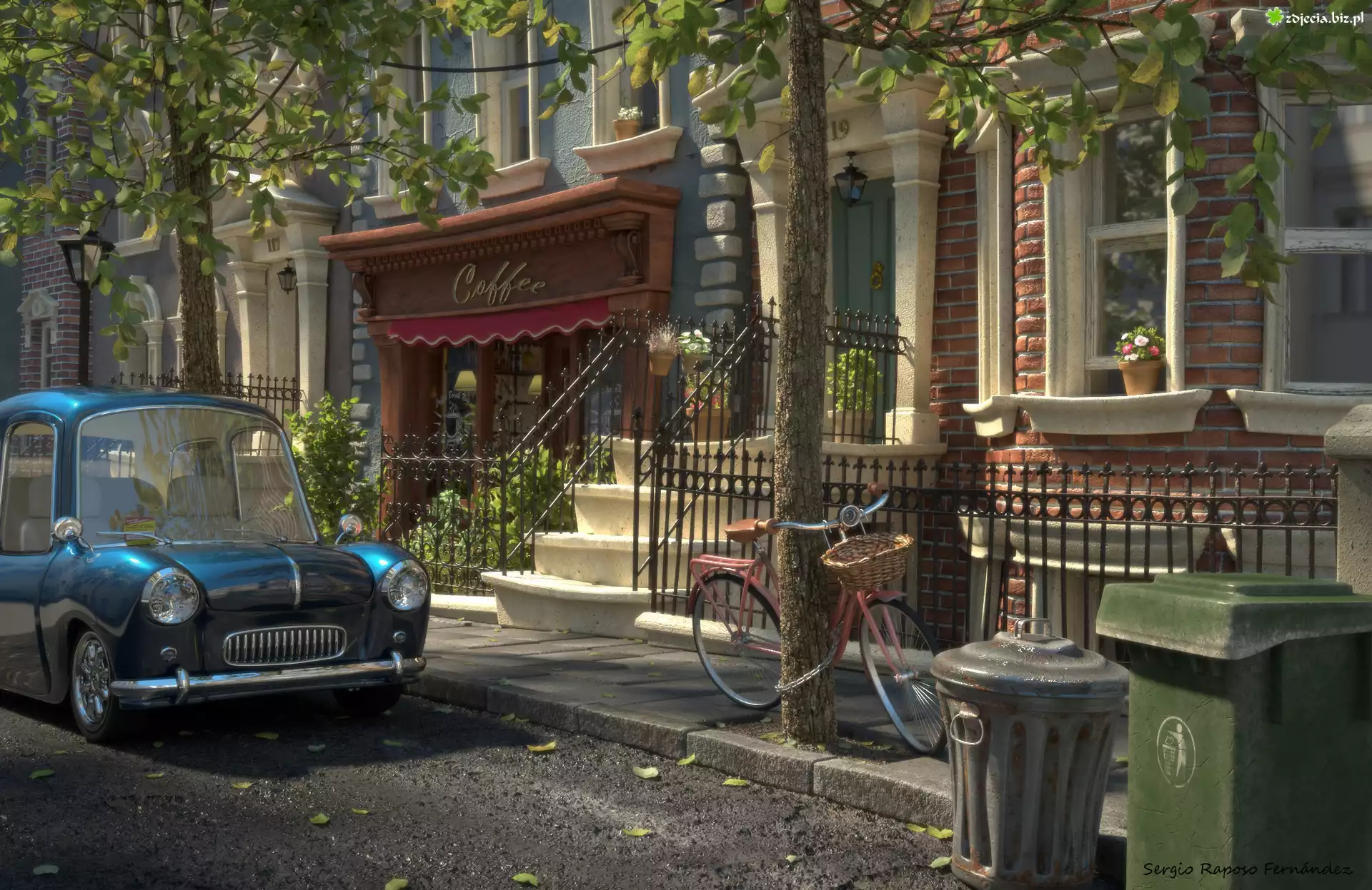Zdjęcie Digital Art, Dom, Uliczka, Samochód, Rower, Kawiarenka
