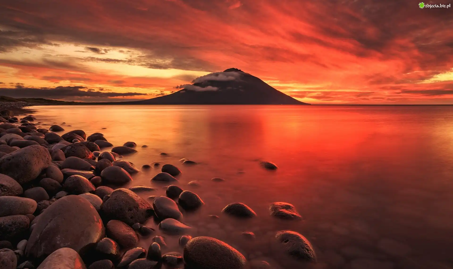 Zdjęcie Zachód słońca, Góra, Stratowulkan Atsonupuri, Morze, Kamienie, Wyspy Kurylskie, Wyspa Iturup, Obwód sachaliński, Rosja |