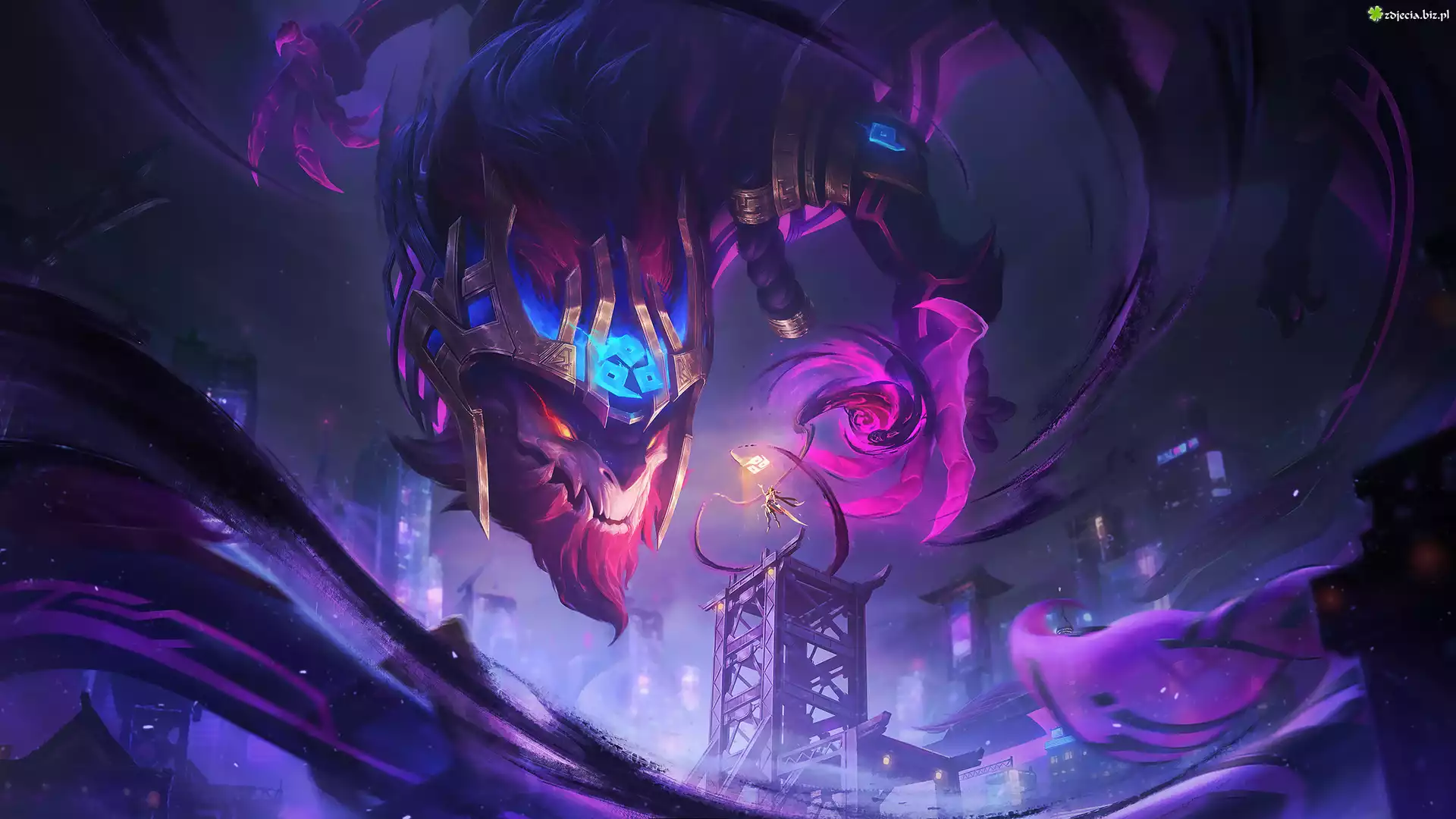 Zdjęcie Gra, League of Legends Inkshadow, Atramentowy cień, Postać, Aurelion Sol, Smok, Szpony, Domy, Mrok |