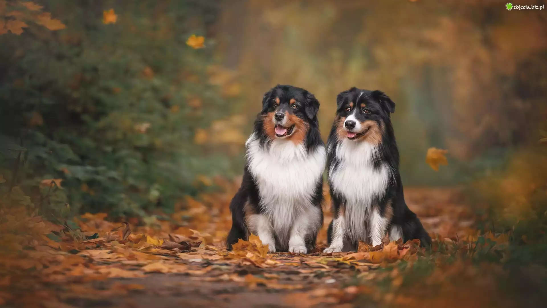 Zdjęcie Psy, Dwa, Owczarki australijskie, Liście, Suche