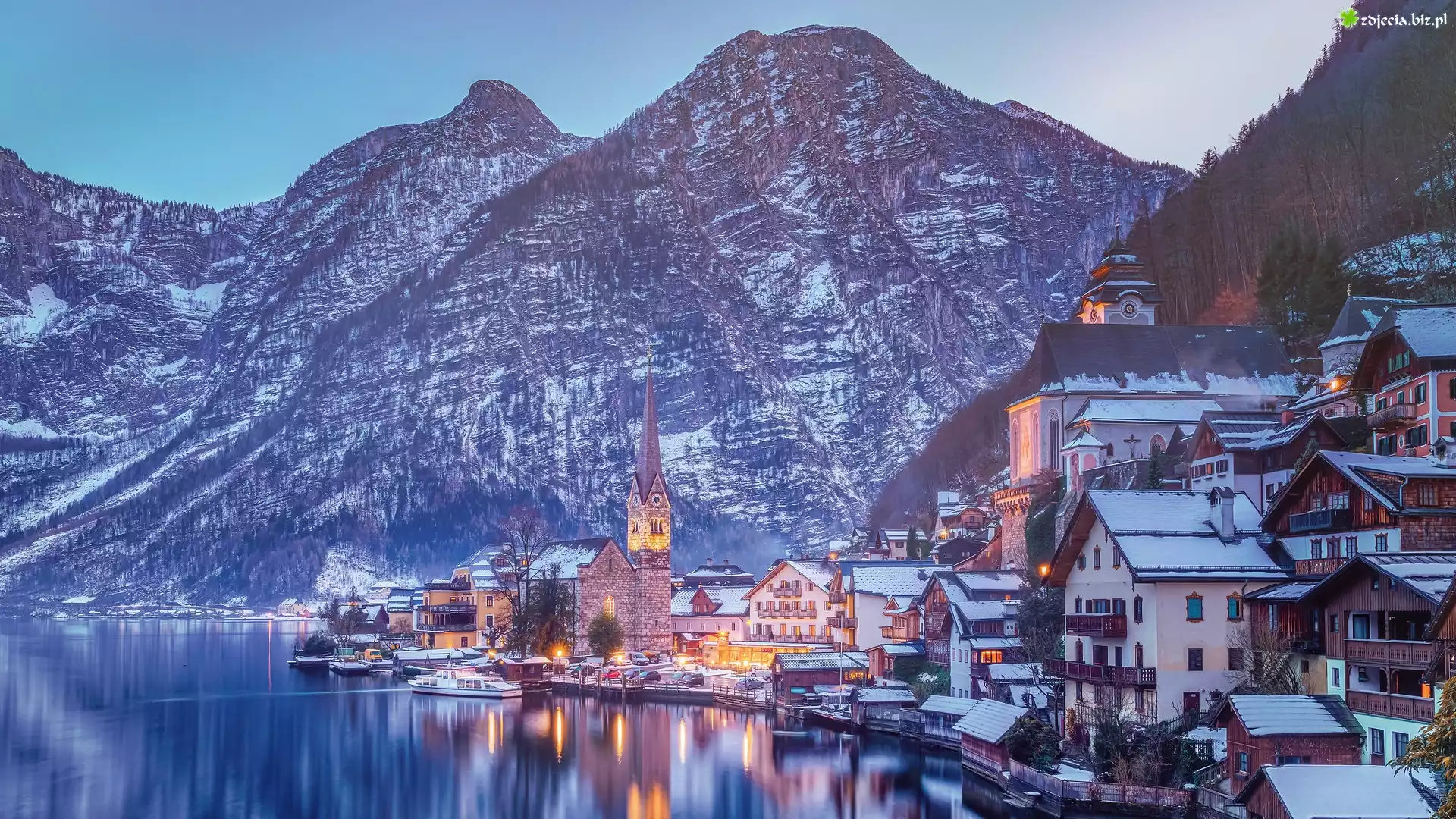 Zdjęcie Jezioro, Hallstattersee Lake, Góry, Kościół, Śnieg, Hallstatt, Austria