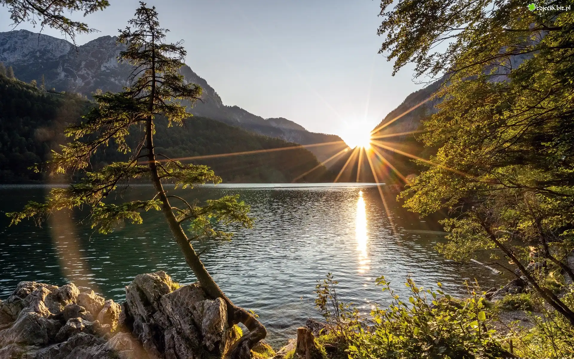 Zdjęcie, Drzewa, Promienie słońca, Góry Hochschwabgruppe, Jezioro Leopoldsteinersee, Styria, Austria