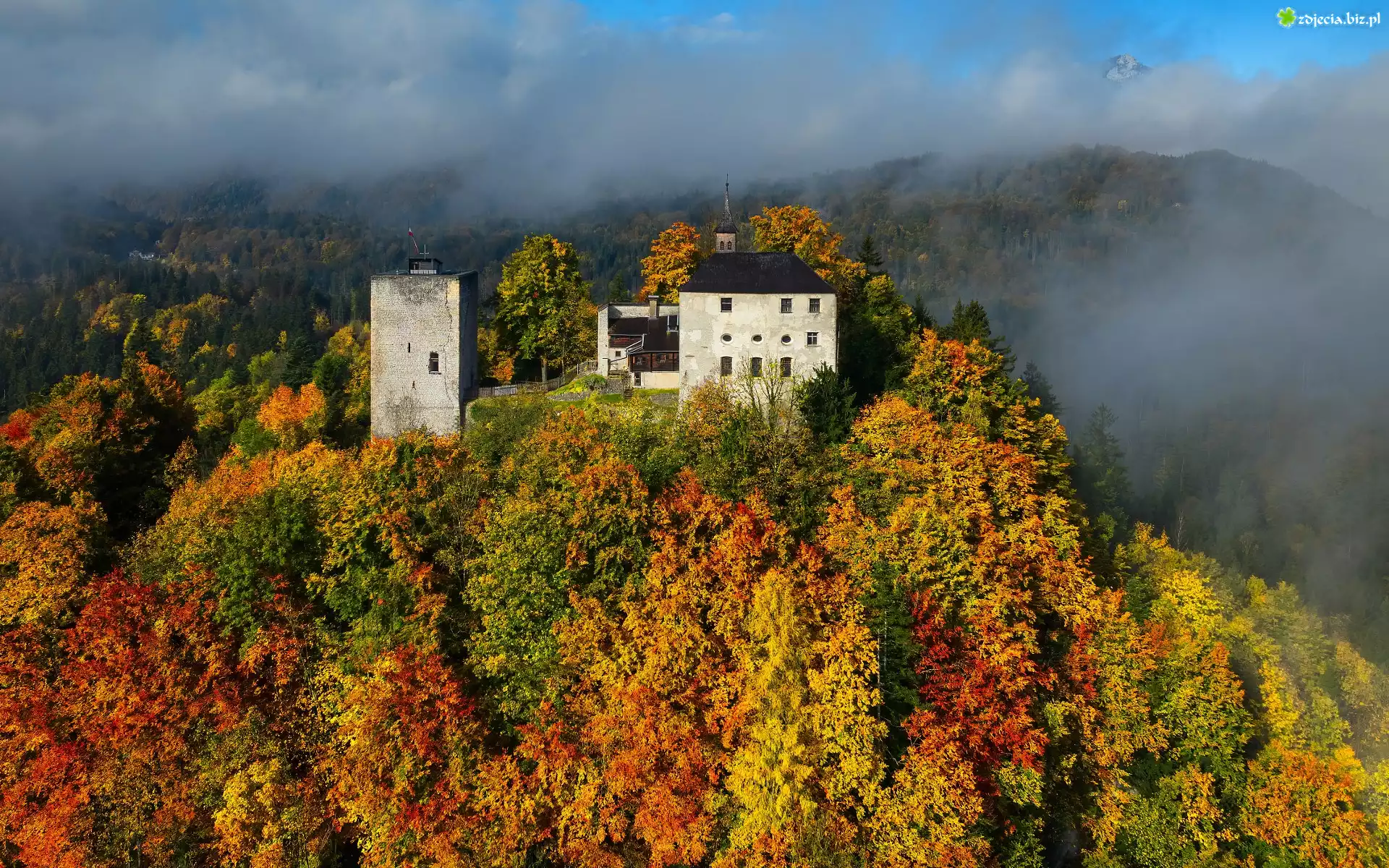 Zdjęcie Góry, Zamek Thierberg, Las, Drzewa, Jesień, Mgła, Austria