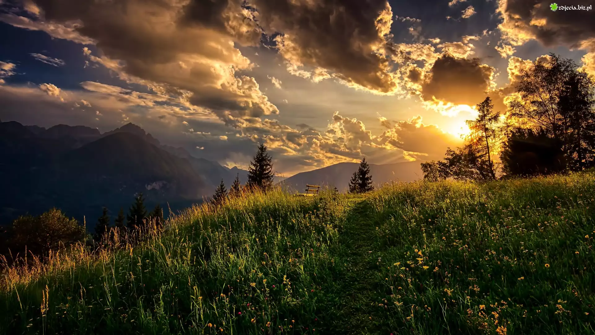Zdjęcie Austria, Lienz, Niebo, Chmury, Góry Alpy, Słońce, Łąka, Drzewa, Ławka