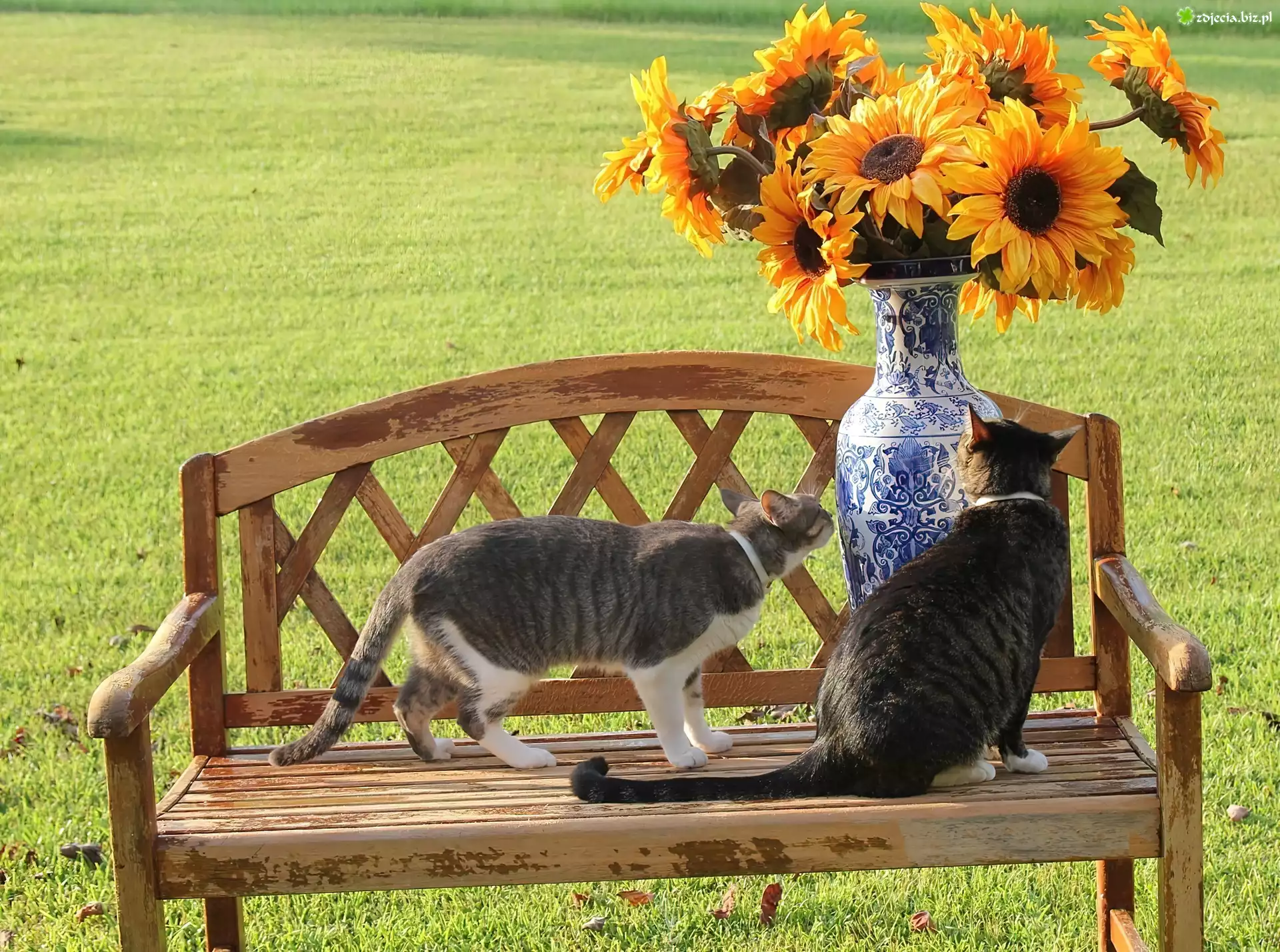 Zdjęcie Słoneczniki, Ławka, Kotki