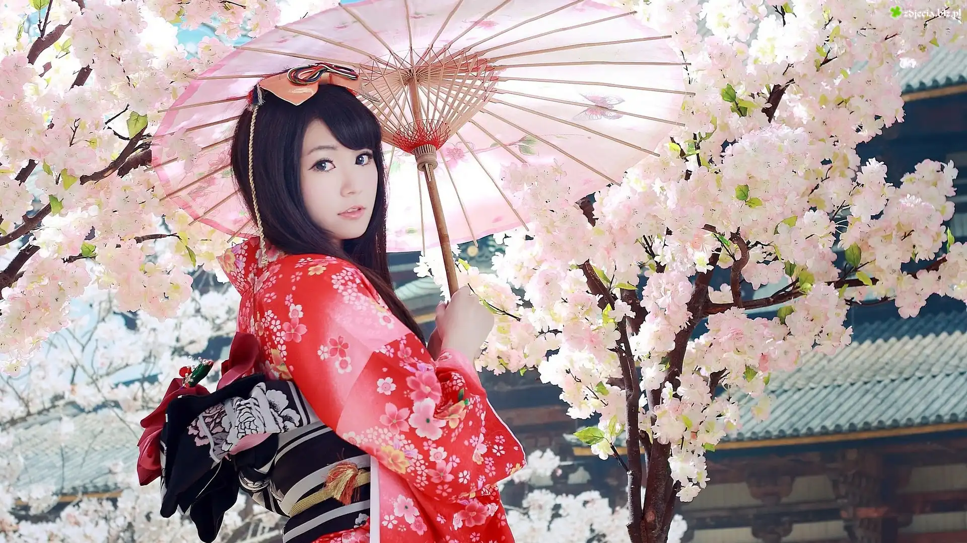 Zdjęcie Kobieta, Azjatka, Parasol, Kimono, Kwitnąca, Wiśnia, Drzewo