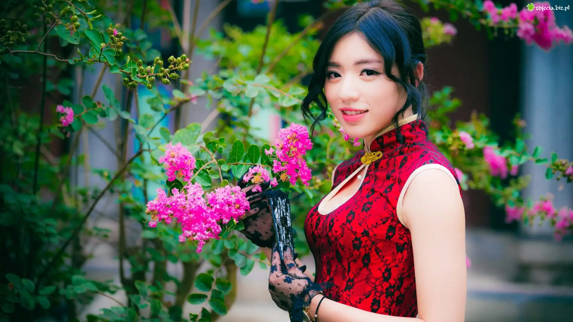 Zdjęcie Kobieta, Azjatka, Czerwona, Sukienka, Rękawiczki, Wachlarz, Kwiaty