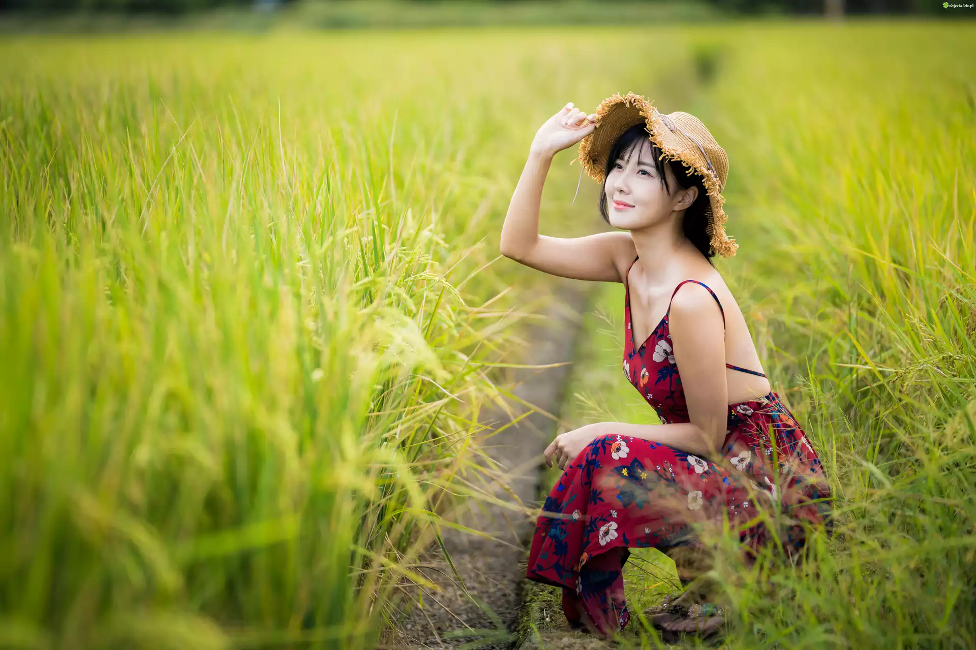 Zdjęcie, Uśmiechnięta, Młoda, Kobieta, Azjatka, Kapelusz, Pole, Ścieżka