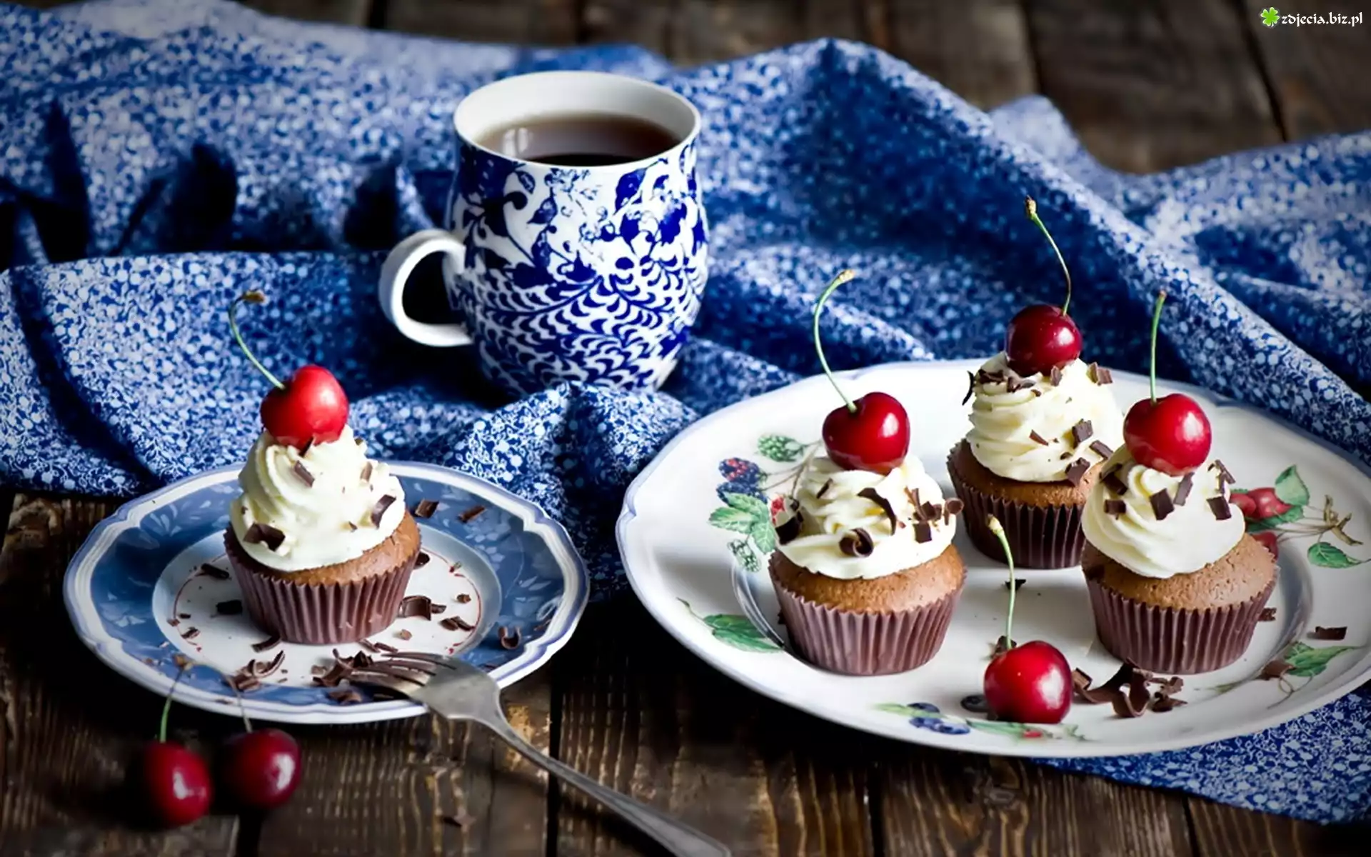 Zdjęcie Babeczki, Wiśnie, Herbata, Talerze, Filiżanka, Widelec
