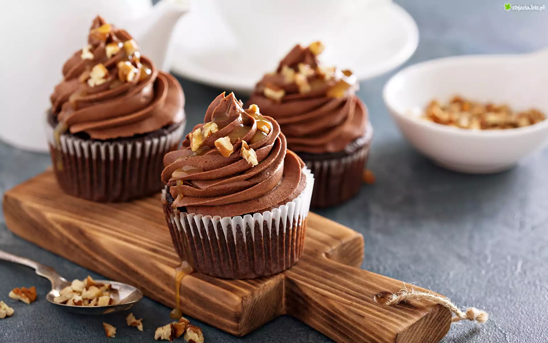 Zdjęcie Trzy, Babeczki, Krem, Orzechy, Deska