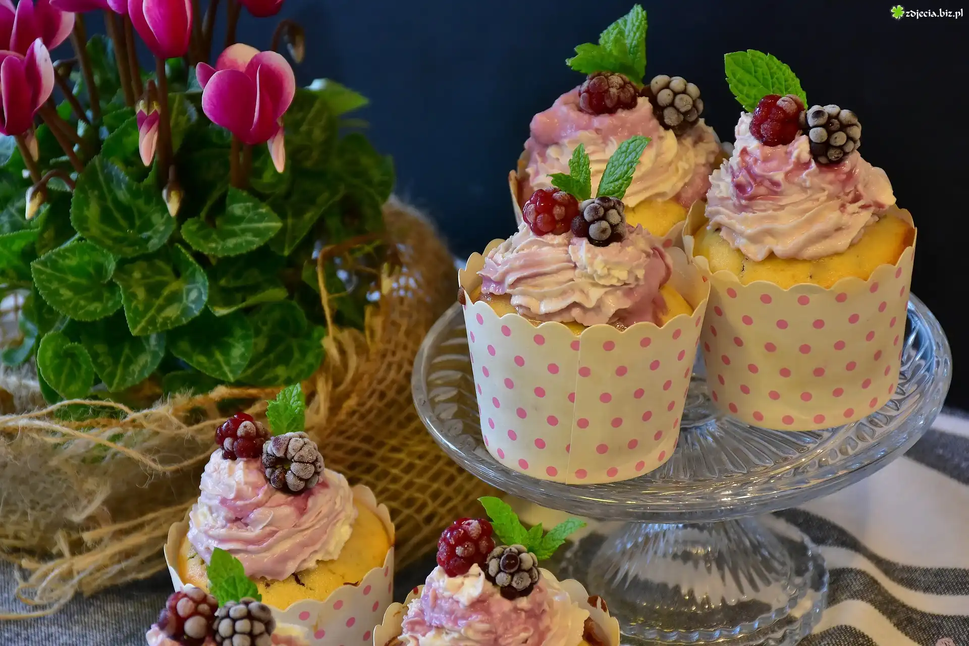 Zdjęcie, Babeczki, Muffinki, Śmietana, Owoce, Kwiat, Cyklamen