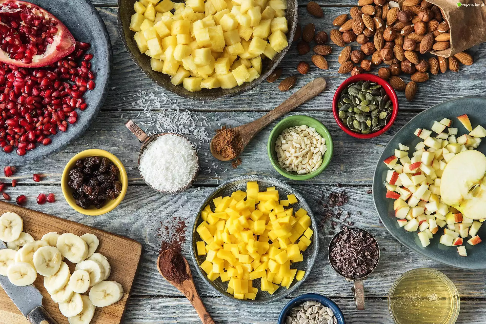 Zdjęcie, Owoce, Bakalie, Miseczki