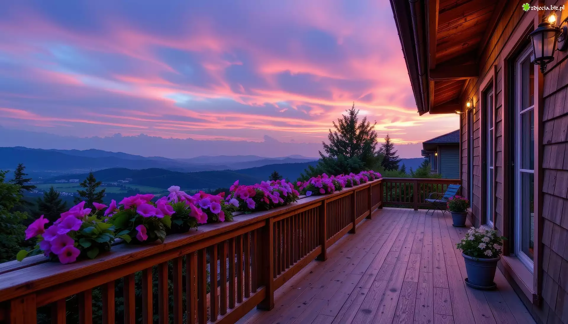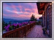 Zdjęcie Kwiaty, Dom, Balkon, Balustrada, Zachód słońca