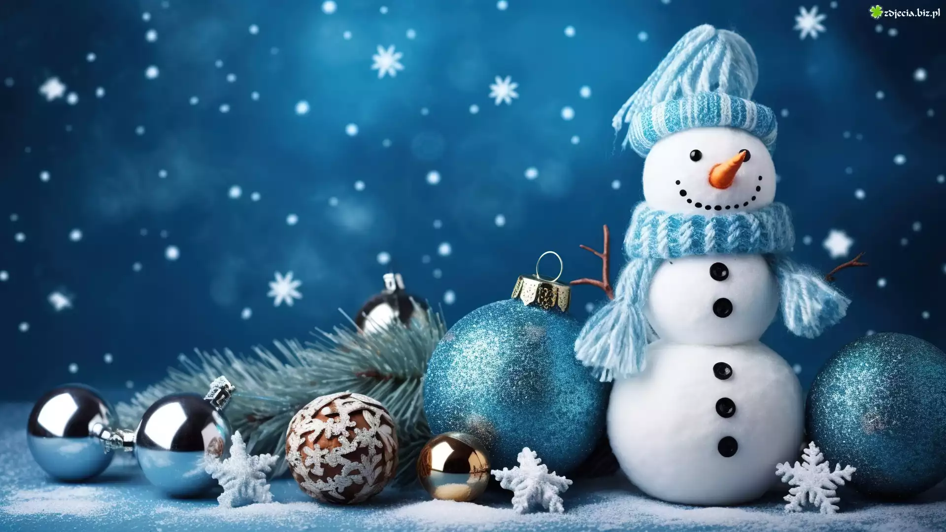 Zdjęcie Bałwan, Niebieska, Czapka, Szalik, Bombki, Gałązka, Gwiazdy, Boże Narodzenie