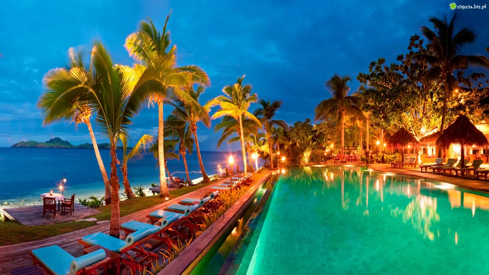 Zdjęcie Basen, Palmy, Leżaki, Plaża, Morze, Wieczór, Hotel, Wakacje