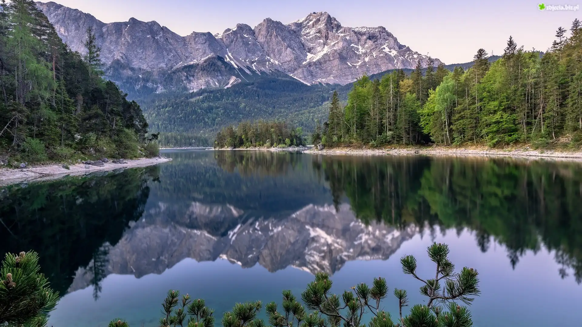 Zdjęcie Góry, Alpy Bawarskie, Szczyt Zugspitze, Jezioro Eibsee, Drzewa, Odbicie, Bawaria, Niemcy