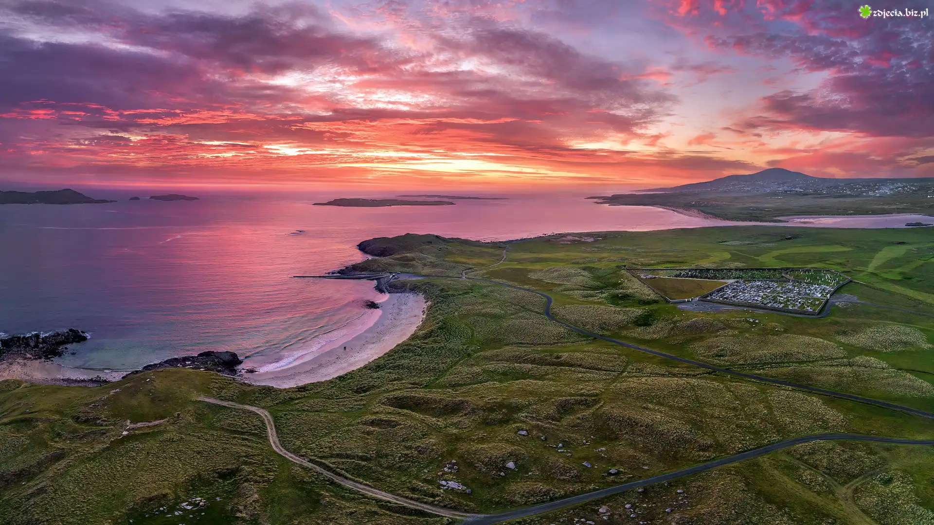 Zdjęcie Wybrzeże, Morze, Plaża, Tra Dhearg Beach, Zachód słońca, Chmury, Hrabstwo Donegal, Irlandia |