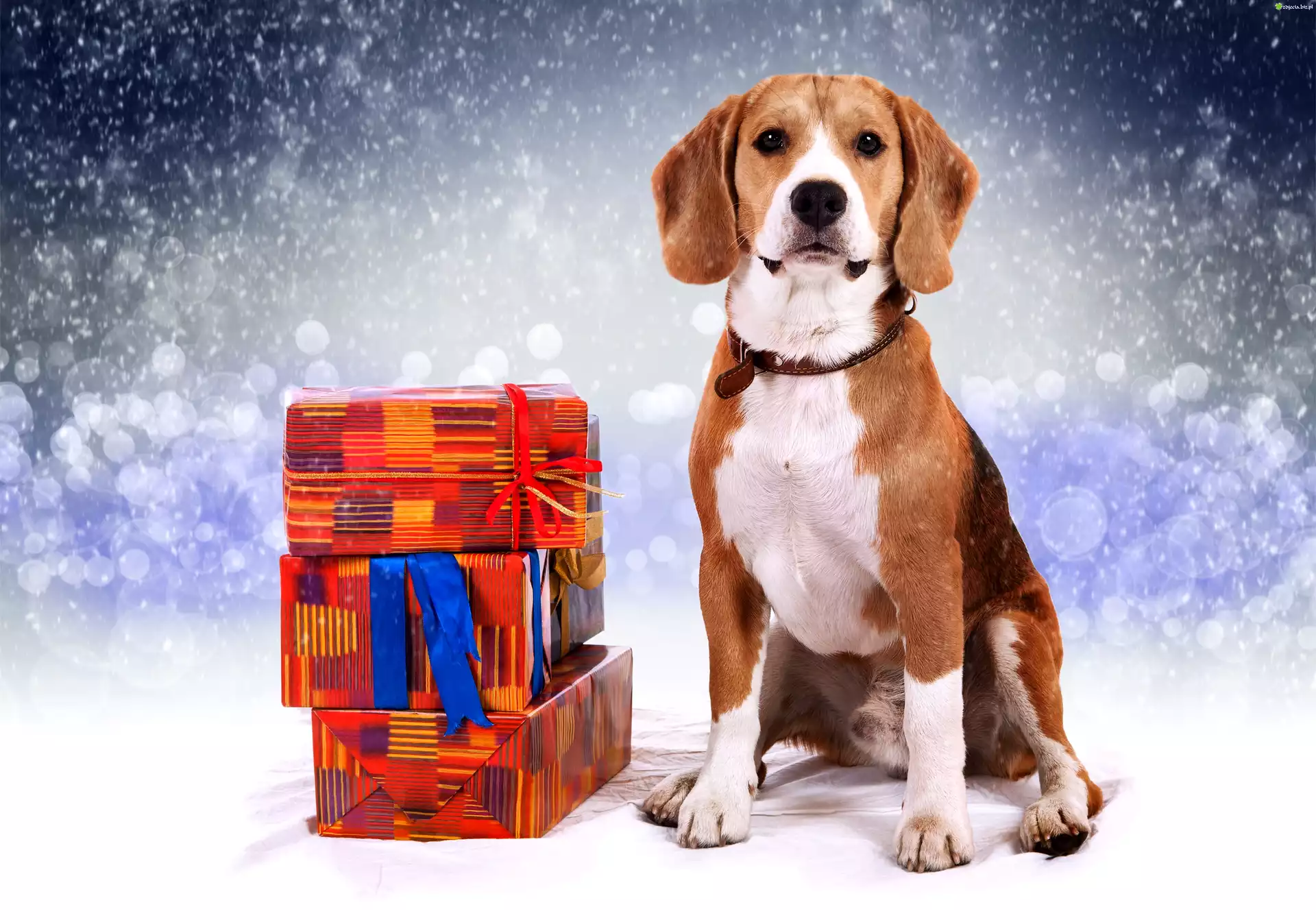 Zdjęcie Beagle, Prezenty, Padający, Śnieg