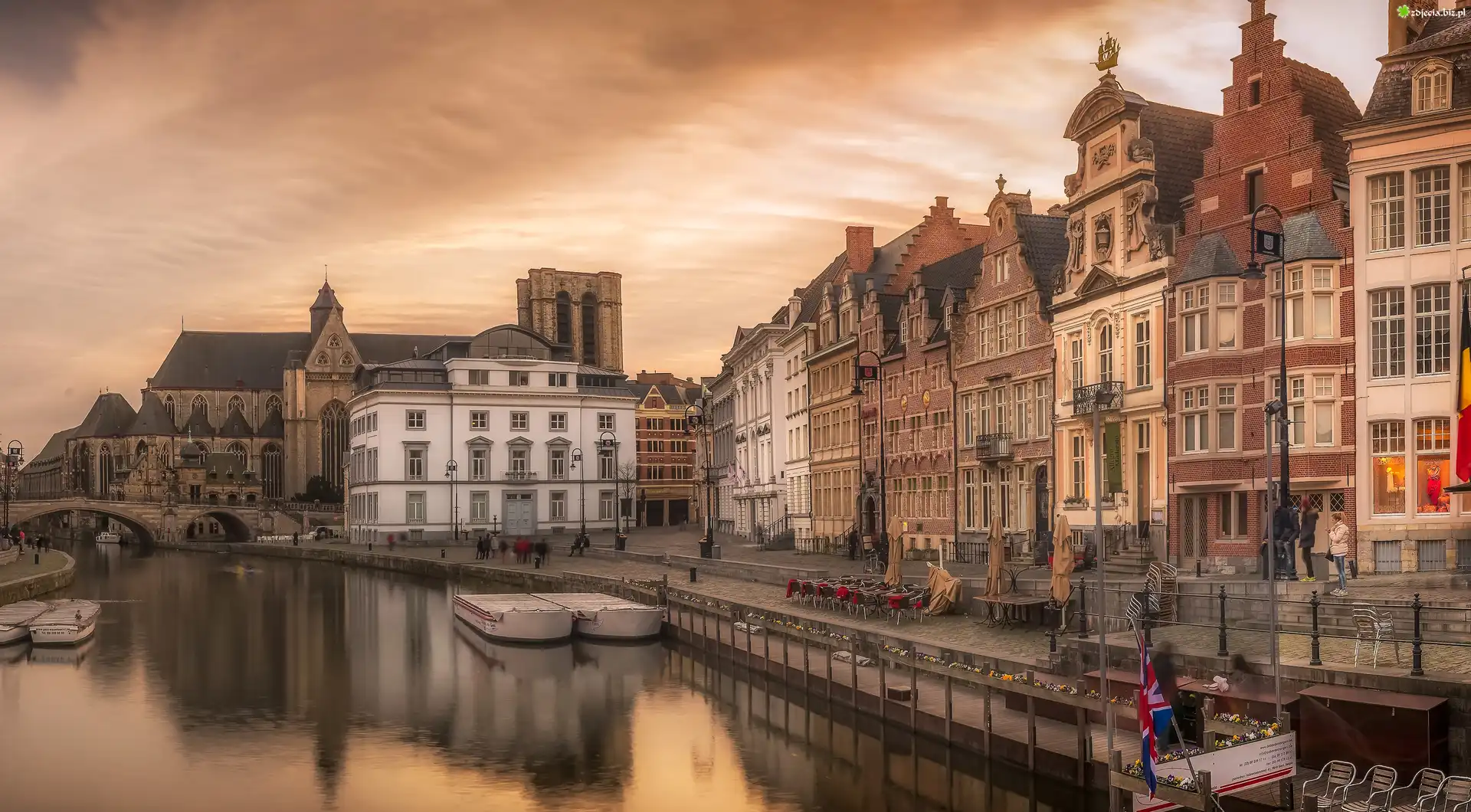Zdjęcie Zachód słońca, Domy, Rzeka Leie, Kanał, Most, Łodzie, Gandawa, Belgia