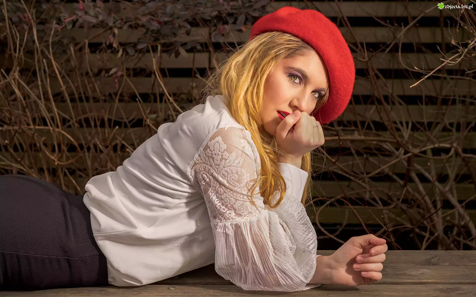 Zdjęcie Kobieta, Blondynka, Czerwony, Beret, Biała, Bluzka, Deski