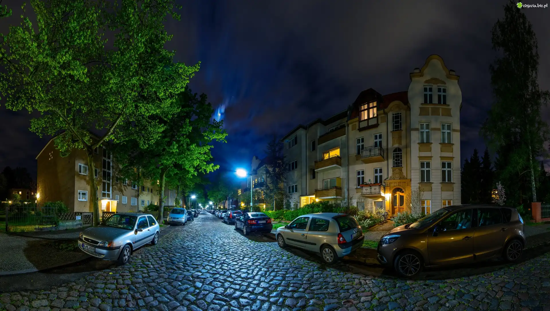 Zdjęcie, Niemcy, Berlin, Noc, Światła, Bloki, Samochody, Droga, Drzewa