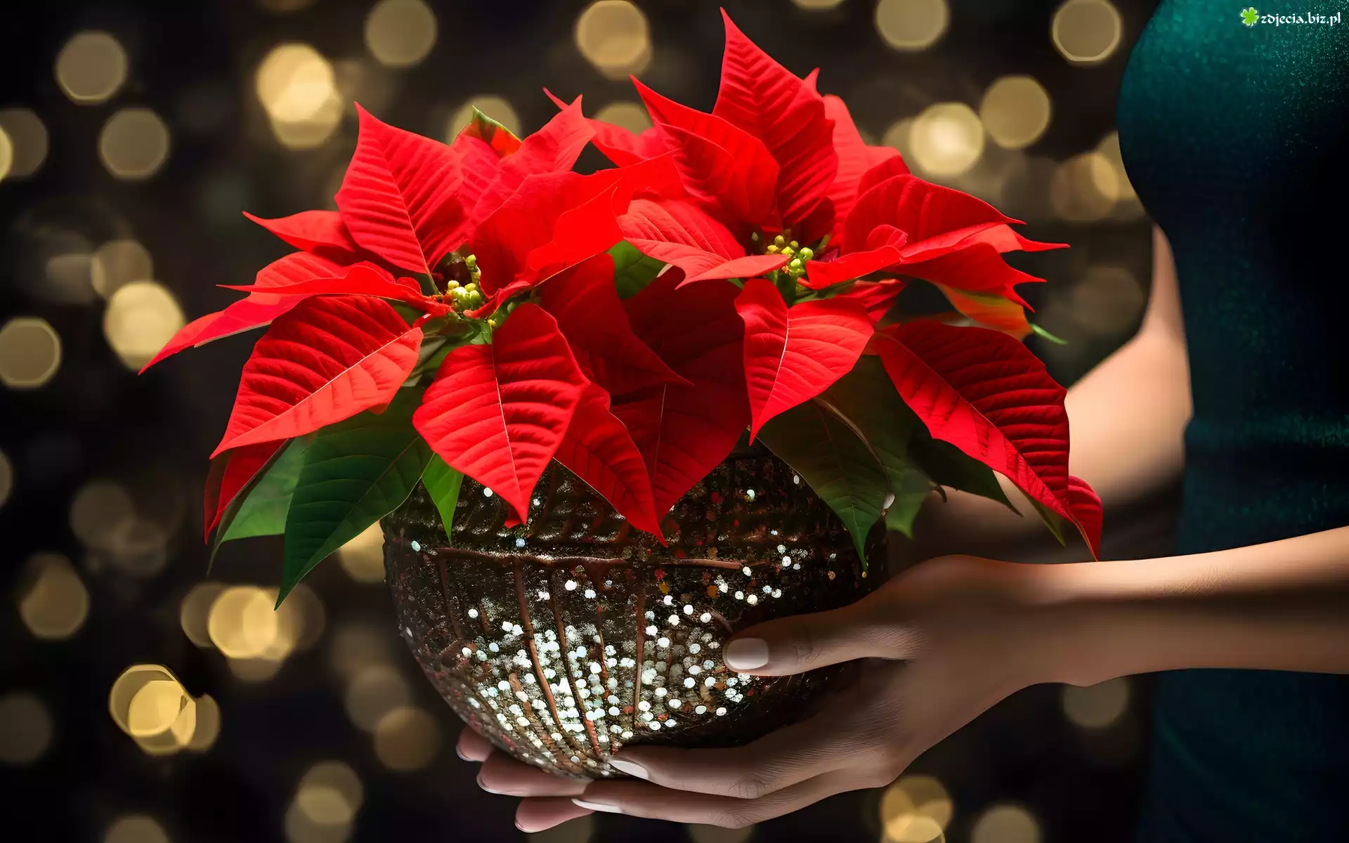 Zdjęcie, Grafika, Kwiat, Gwiazda betlejemska, Dłonie, Doniczka