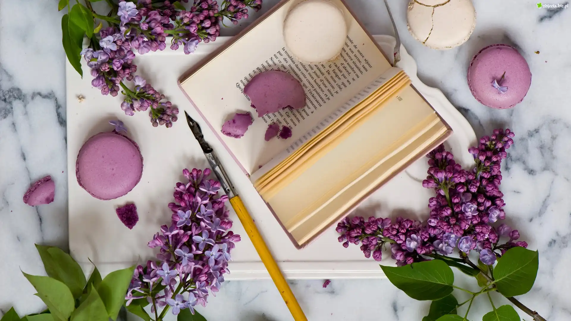Zdjęcie Kompozycja, Bez, Książka, Pióro, Blat, Ciasteczka, Makaroniki
