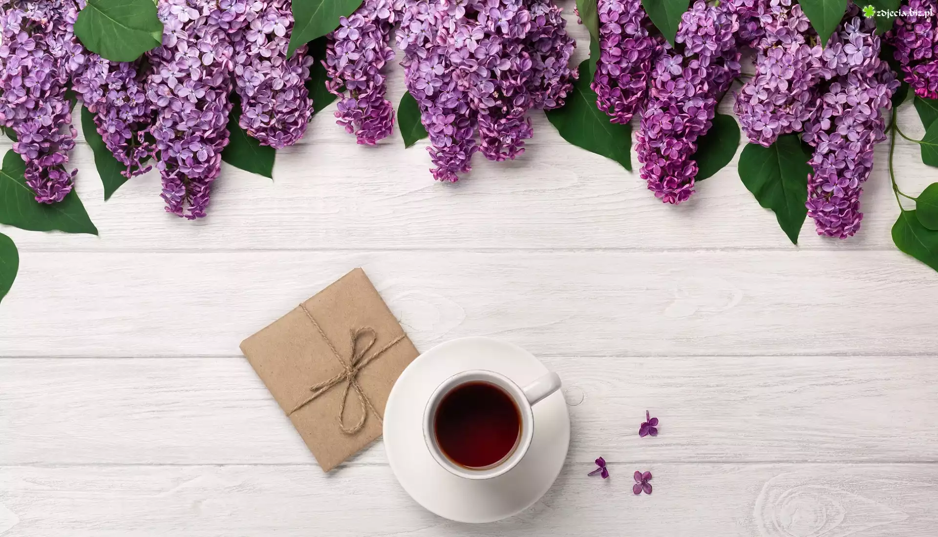 Zdjęcie Kwiaty, Bez, Biała, Filiżanka, Kawa, Prezent, Deski