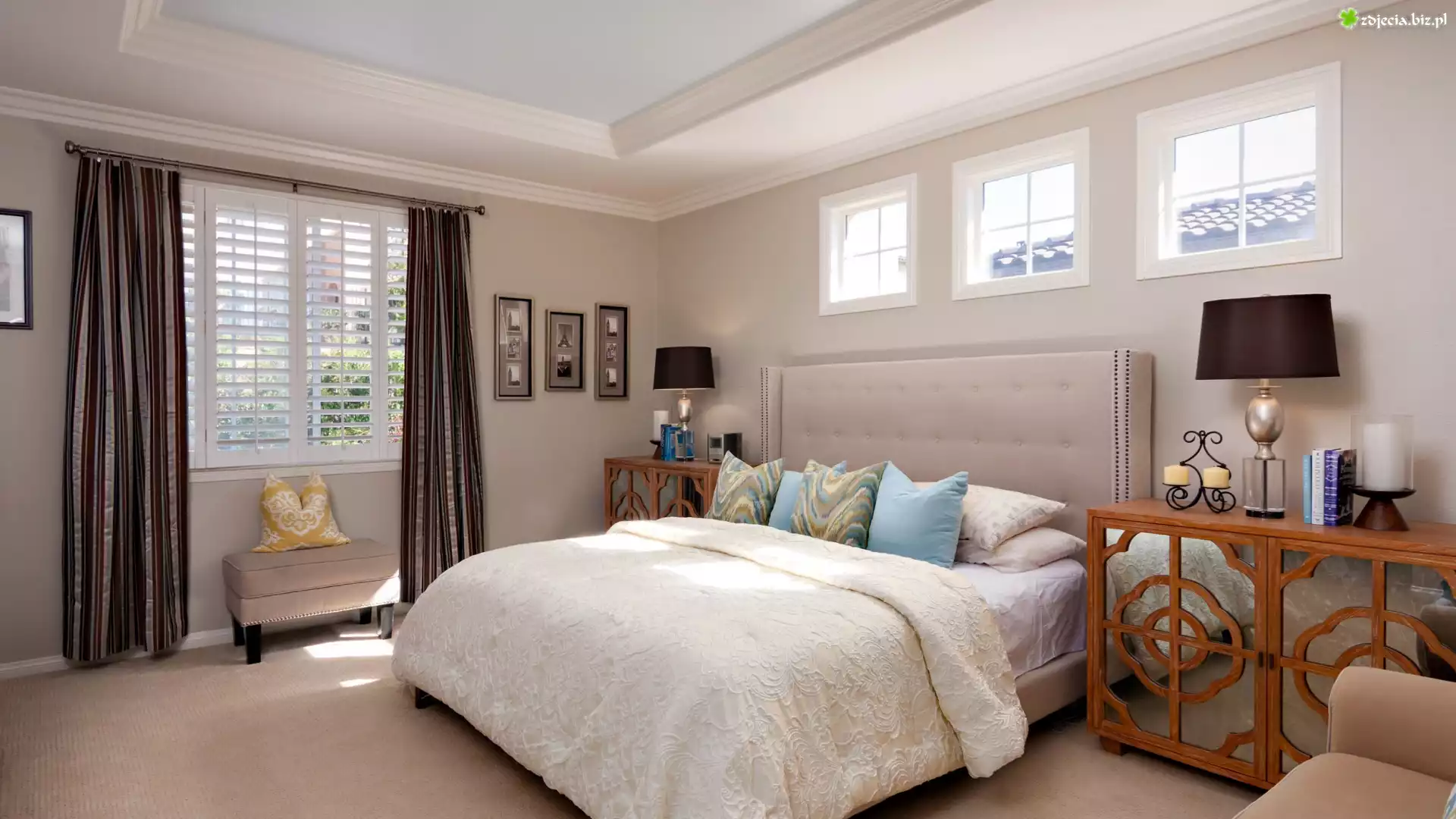 Zdjęcie, Beżowa, Sypialnia, Komody, Lampy