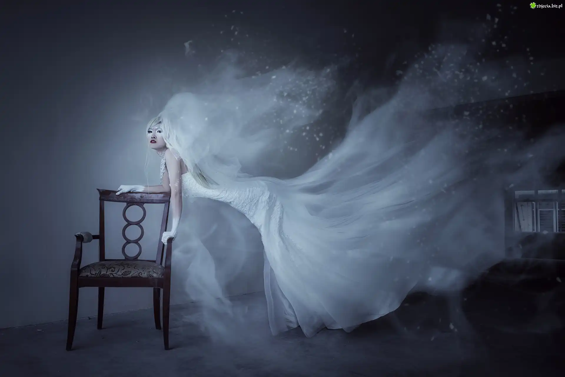 Zdjęcie Kobieta, Biała, Suknia, Welon, Krzesło, Panna młoda