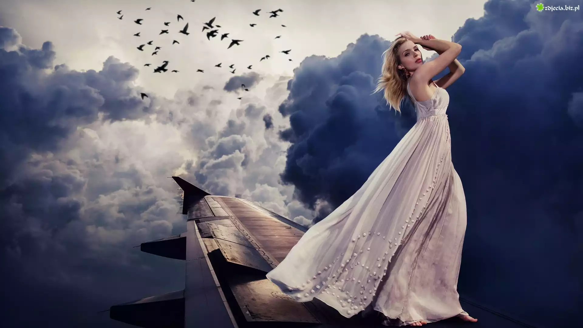 Zdjęcie Kobieta, Biała, Suknia, Ptaki, Ciemne, Chmury, Skrzydło, Samolotu