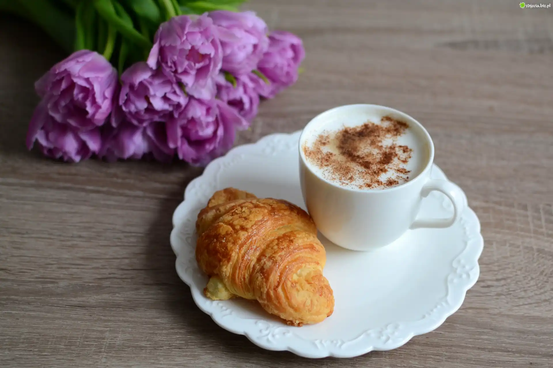 Zdjęcie Biała, Filiżanka, Kawa, Rogalik, Talerzyk, Tulipany