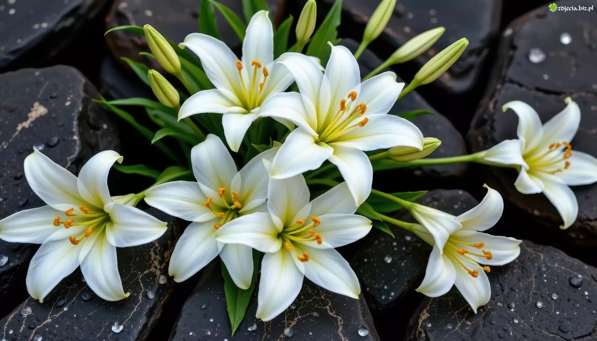 Zdjęcie Kwiaty, Białe, Lilie, Kamienie, Krople