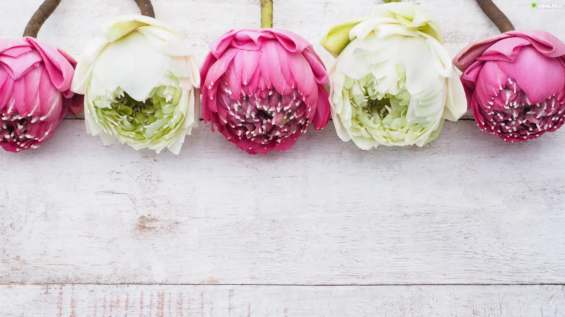 Zdjęcie, Białe, Różowe, Kwiaty, Lotosy, Deski