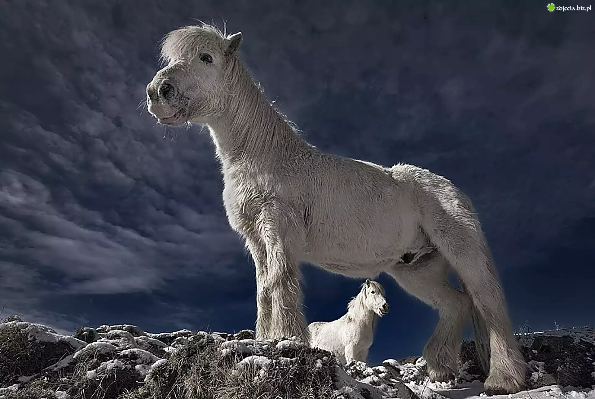 Zdjęcie, Białe, Konie, Niebo, Śnieg, Skały