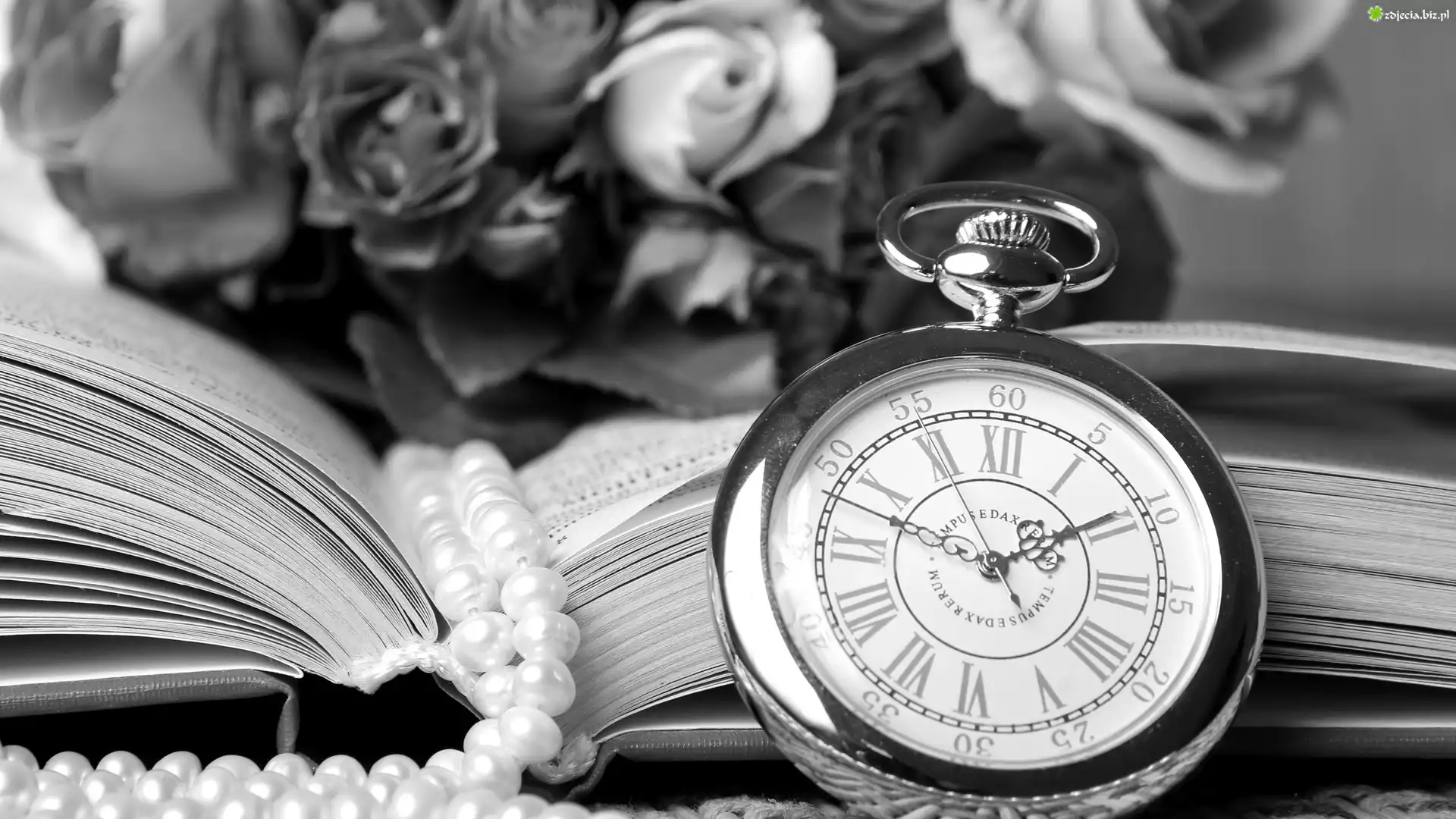 Zdjęcie Kompozycja, Książka, Perły, Zegarek, Róże, Rozmyte, Tło, Czarno-Białe