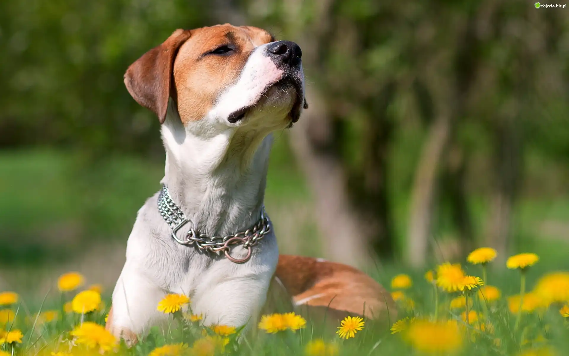 Zdjęcie Biało, Rudy, Pies, Łąka, Żółte, Mlecze