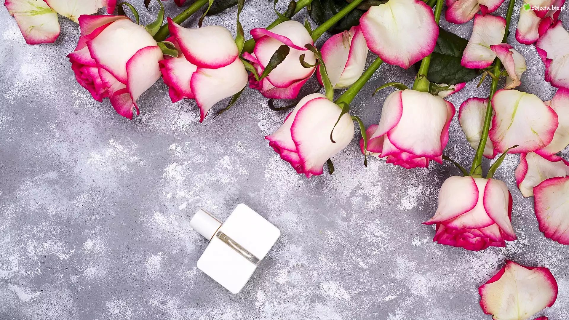 Zdjęcie, Róże, Biało-różowe, Buteleczka, Perfumy, Szare, Tło