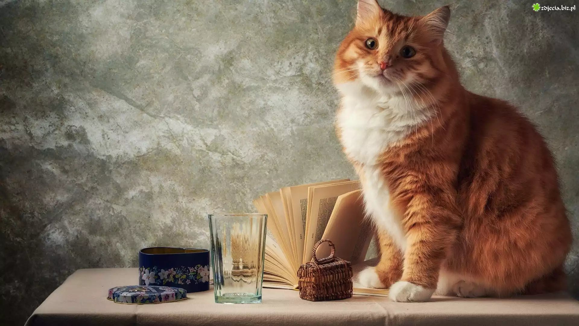 Zdjęcie Biało-rudy, Kot, Otwarta, Książka, Wiklinowe, Pudełko, Szklanka, Żelazne, Pudełko