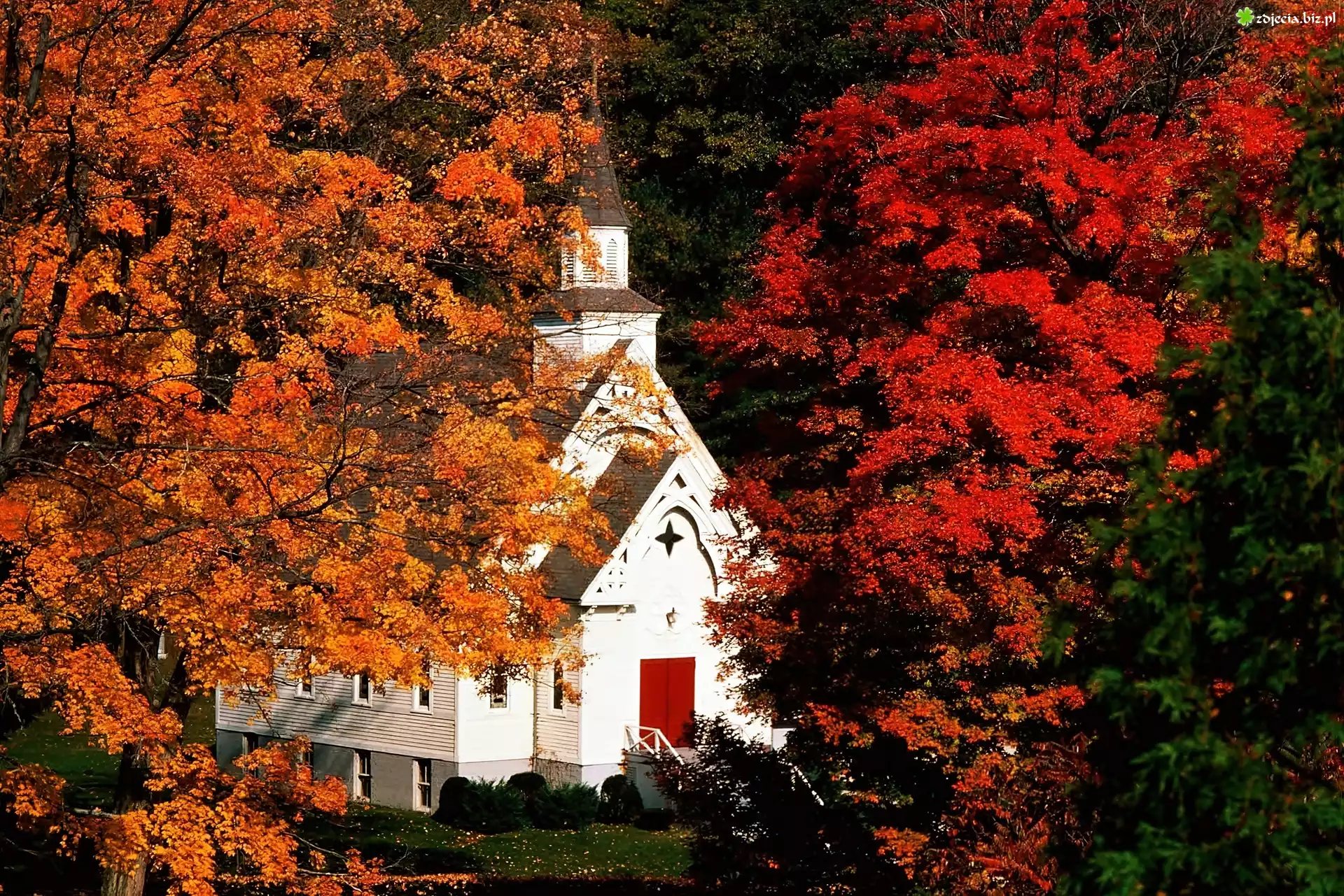 Zdjęcie, Biały, Kościółek, Jesienne, Drzewa